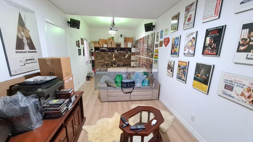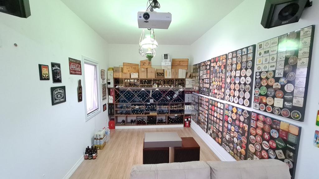 Adega, home-theater, quarto, closet, banheiro, garagem p/ 4 carros e depósito.