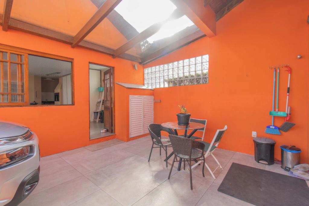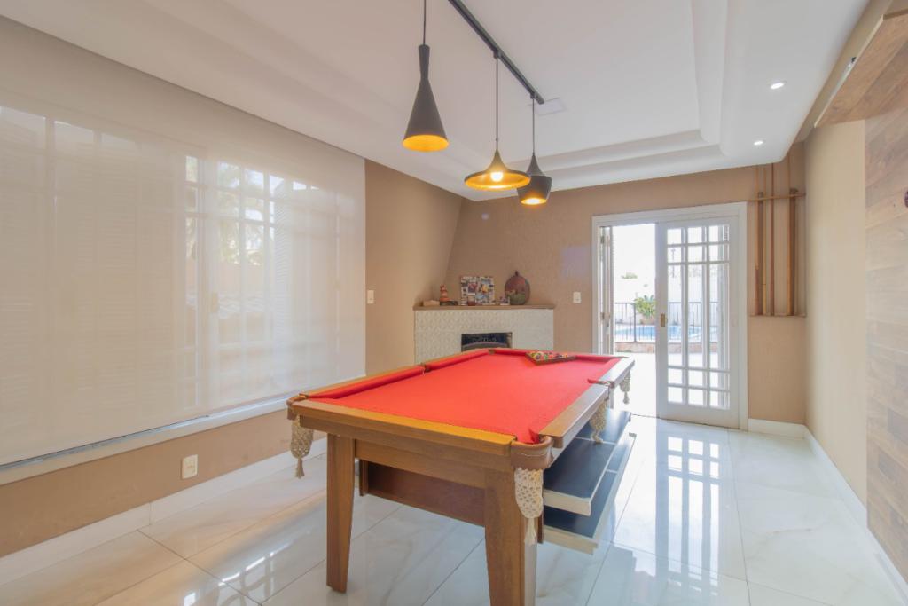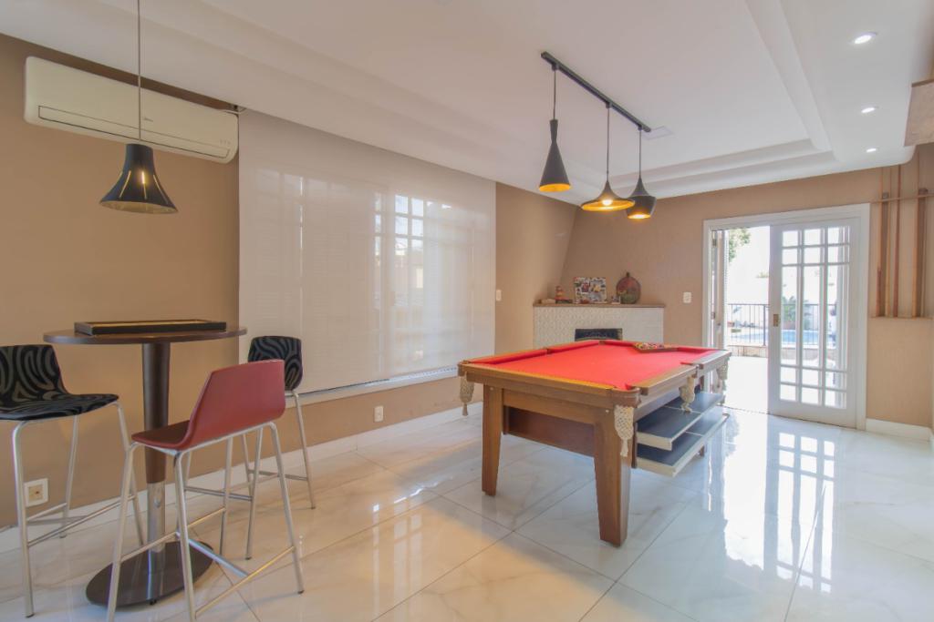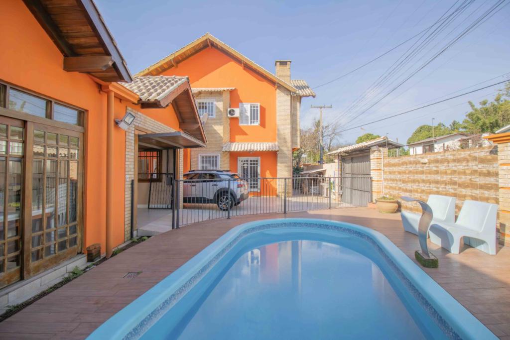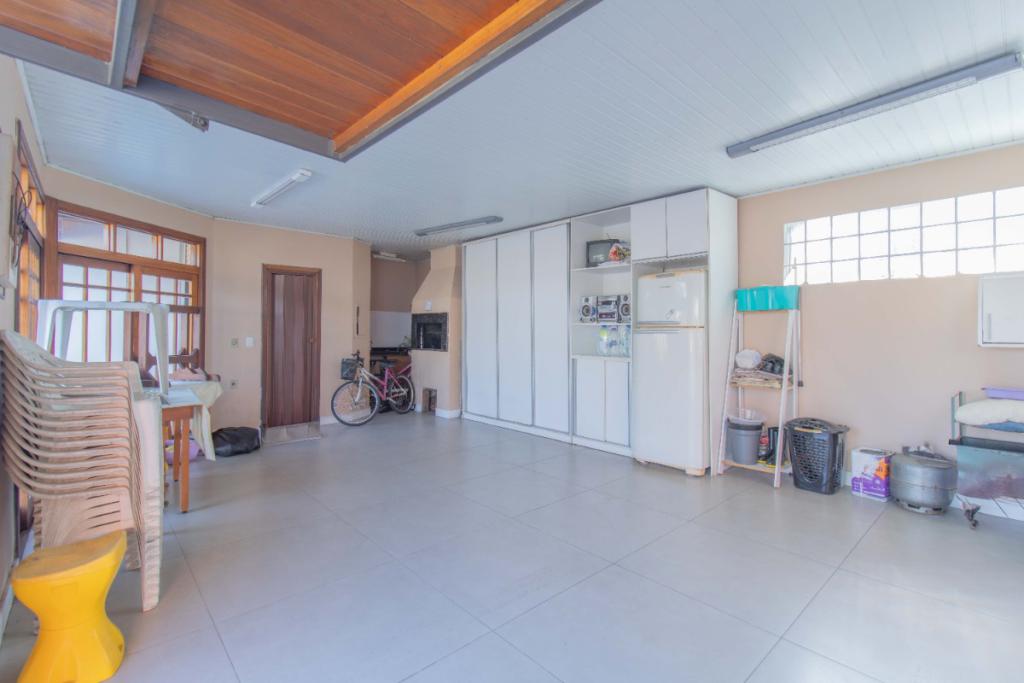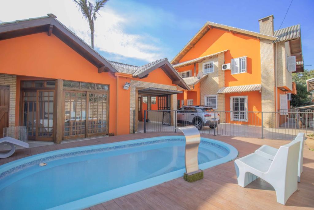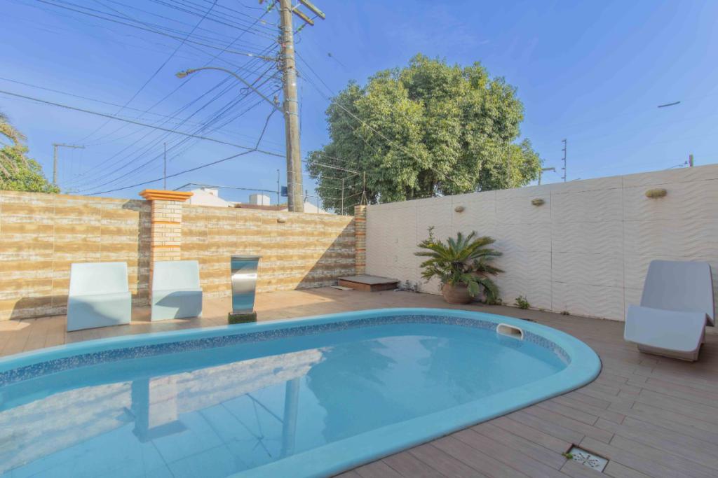 Pátio com piscina, salão com churrasqueira, lavanderia e garagem.