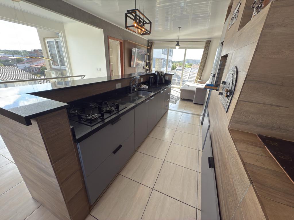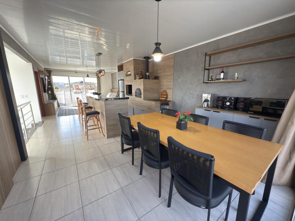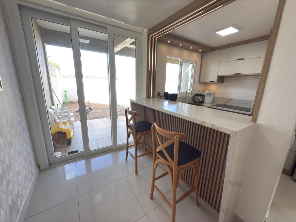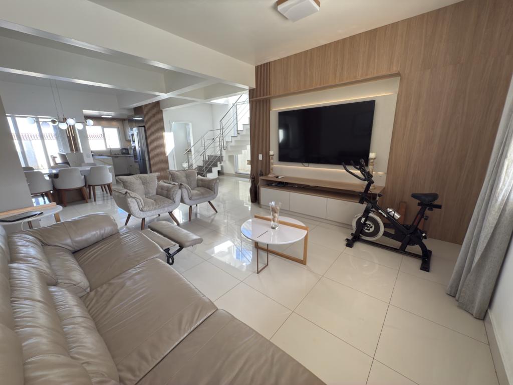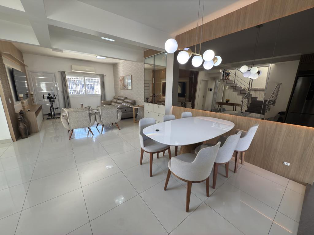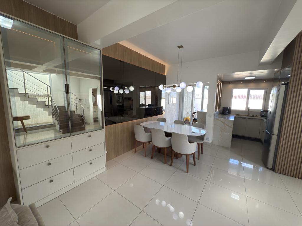 Parte térrea: living 3 ambinetes em conceito aberto, banheiro social, sala de jantar, cozinha montada com armários sob - medida e pátio.