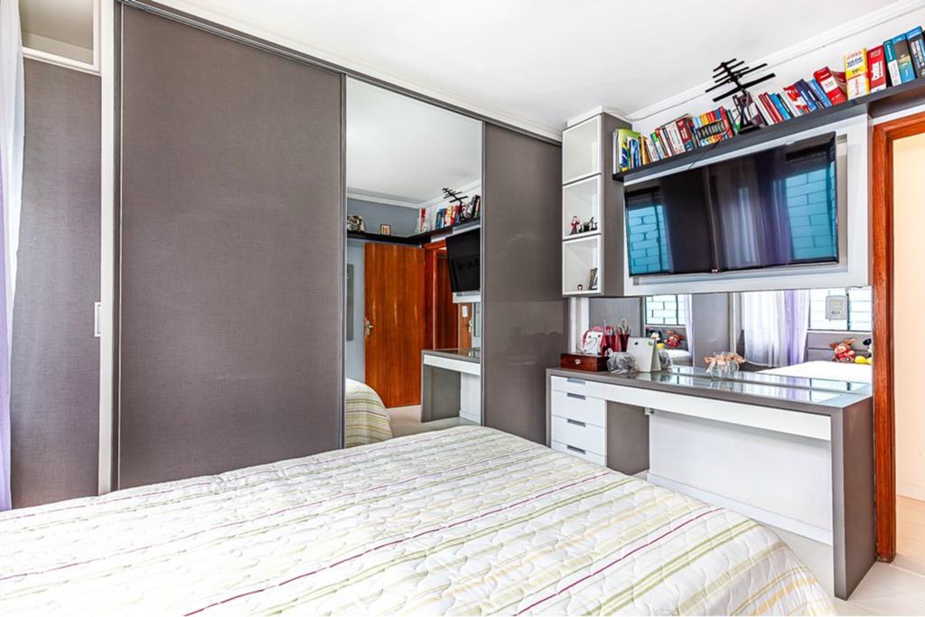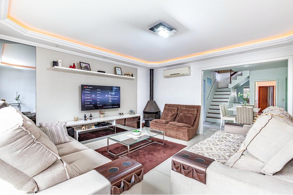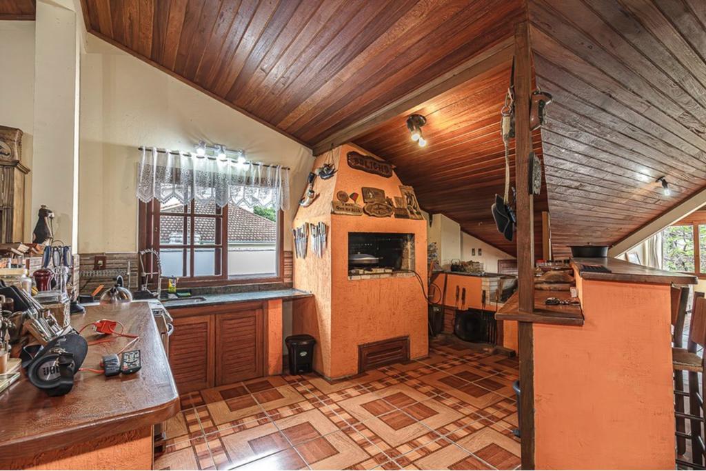 Internamente, a casa é um convite ao bem-estar, com lareira, muito acolhedora, lavabo, cozinha americana, três dormitórios na parte inferior com banheiro social e suíte. No andar superior, conta com mais dois dormitórios e banheiro social.